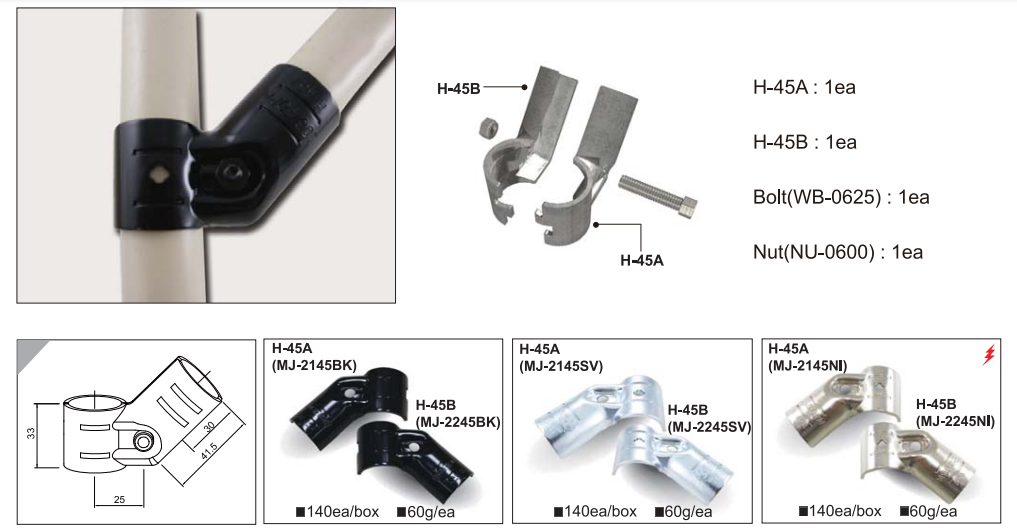 Bộ khớp nối HJ-45 được sử dụng rộng rãi trong đời sống. Áp dụng để liên kết các ống inox, ống thép theo nhiều cách phục vụ mục đích tạo thành những mô hình thực tiễn cho con người như: bàn thao tác, xe đẩy, kệ đựng hàng hóa,…..