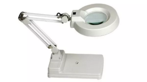 Đây là kính lúp công nghiệp với thiết kế màu trắng, cấu tạo gồm một thấu kính có vành bao quanh, nối với các cánh tay có 3 khớp di chuyển tới các vị trí khác nhau, sau đó được gắn với đế giúp cố định và giữ thăng bằng cho hệ kính lúp này.