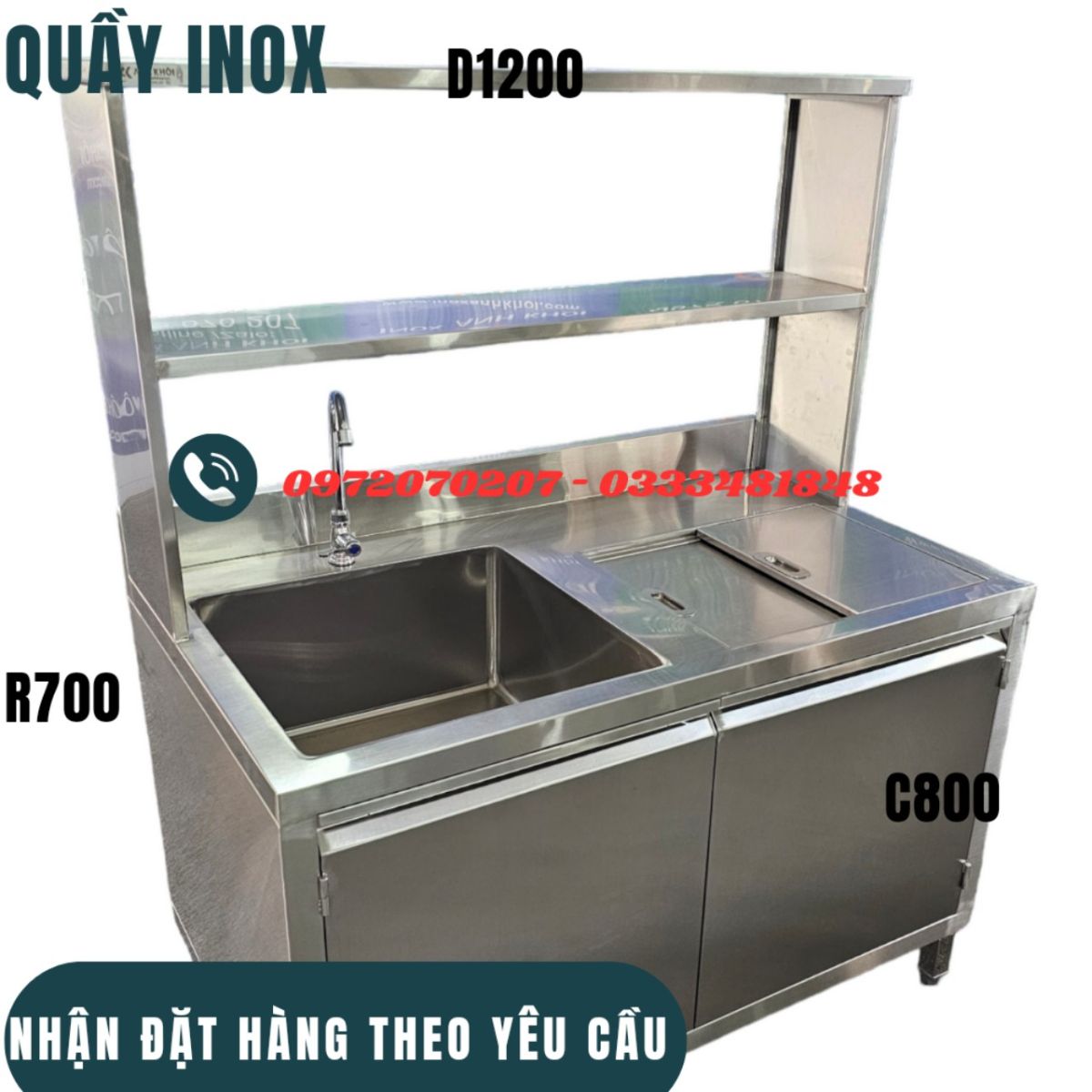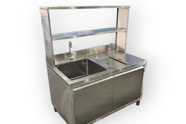 Quầy inox 1m20 có kệ trên phù hợp cho nhiều mô hình kinh doanh như quán cafe nhỏ, quán trà sữa, quầy bar mini hoặc các quầy pha chế di động. Sản phẩm mang lại tính thẩm mỹ cao, tạo nên không gian làm việc chuyên nghiệp và gọn gàng.